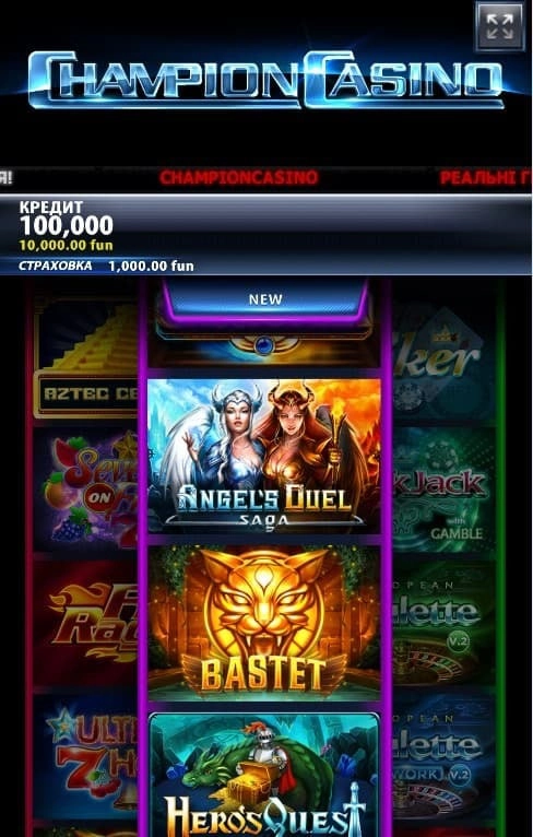 Casino Сhampion пропонує широкий вибір азартних розваг: класичні та відео-слоти, прогресивні джекпоти та live-ігри з реальними круп’є. Доступні популярні слоти, рулетка, блекджек і покер. Такий асортимент робить гру захопливою та різноманітною.