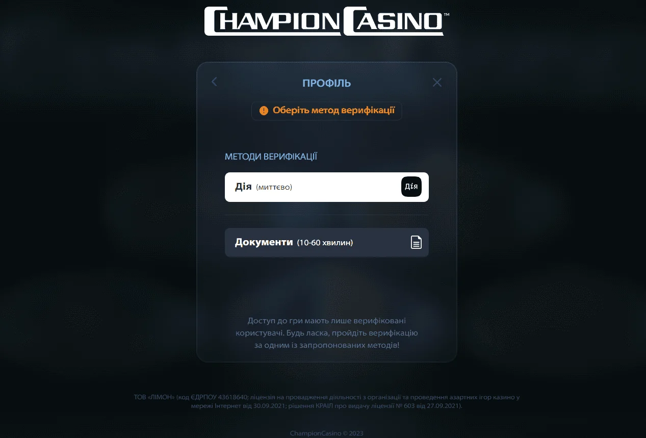 Для безпеки гравців Сhampion казино передбачає обов’язкову верифікацію акаунта. Після підтвердження документів та контактної інформації користувач отримує доступ до ставок, виведення виграшів та бонусів, а обліковий запис стає повністю активним.